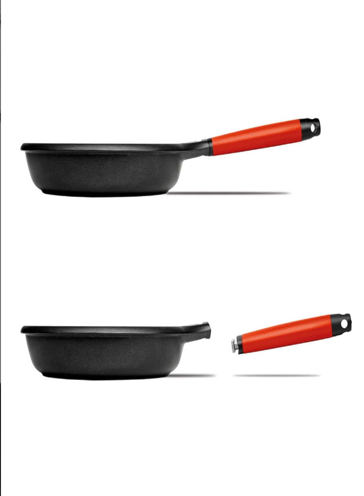 • Mango desmontable para limpiar a mando cómodamente, optimizar espacio en el armario y el lavavajillas, poner y quitar el producto del horno sin quemarse o convertirlo en un molde o cazuela.
