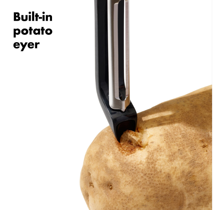 El pelador giratori OXO Good Grips està dissenyat per a mantenir-se còmode a través d’un ús ràpid i repetitiu. És perfecte per a preparar fruites i verdures de pell dura com a pomes i cogombres. Dues fulles esmolades d’acer inoxidable japonès es flexionen per a pelar grans àrees amb cada cop. El mànec de fàcil agarri està dissenyat per a funcionar per a esquerrans i destres, i es manté antilliscant, fins i tot quan està mullat. Un eyer de papa incorporat i durador elimina les imperfeccions sense arruïnar els seus productes. L’ansa inclou un orifici per a l’emmagatzematge penjant. Resistent a la corrosió i apte per a rentavaixella. Característiques La fulla d’acer inoxidable japonesa esmolada es llisca sobre fruites i verdures Les fulles bessones giratòries es flexionen per a pelar grans àrees amb cada cop Construcció a prova d’òxid per a ús a llarg termini Dissenyat per a productes de pell ferma o dura com a pomes i patates El mànec suau i antilliscant esmorteeix les mans per a un agarri còmode El trau de patata incorporat elimina les imperfeccions